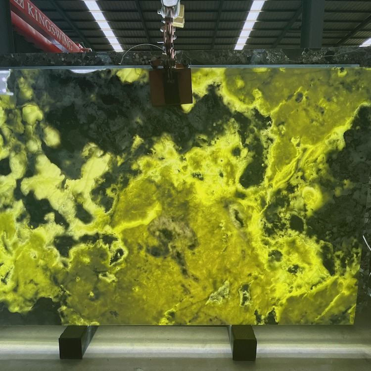 Sublimez la translucidité de la pierre par un polissage miroir, la laissant rayonner sous la lumière directe. Associez-la à l'éclat chaleureux des luminaires en or satiné et à la présence profonde et massive des accents d'onyx noir pour créer un espace d'un luxe intense et raffiné.