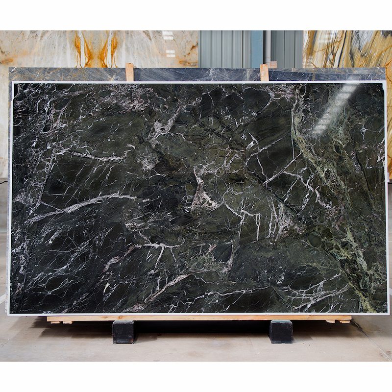 Marbre vert foncé naturel — pierre haut de gamme et durable aux veines émeraude uniques. Idéal pour les plans de travail, les sols et les revêtements muraux. Découpes sur mesure disponibles. Écologique, élégant et naturellement unique.